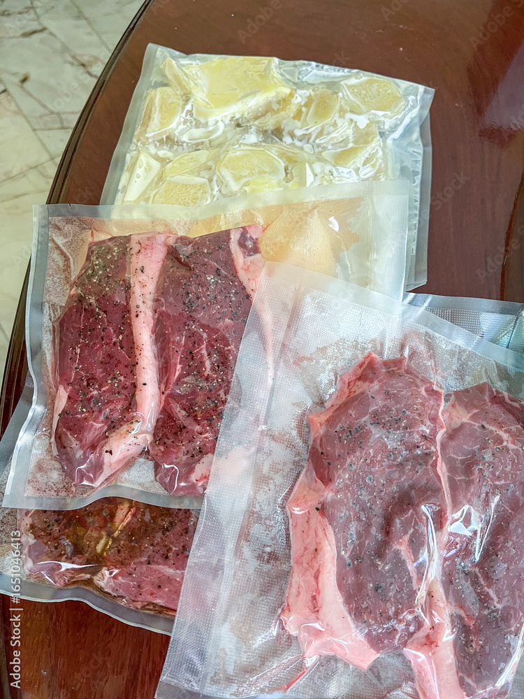Vacuum-Sealed Meats and Seasoned Ingredients on Wooden Table