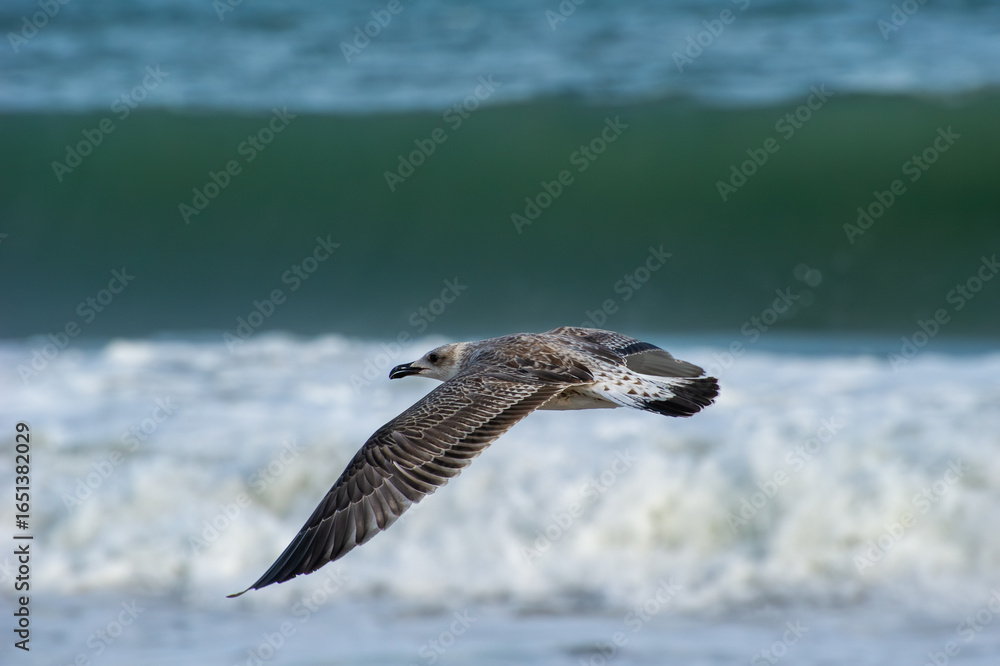 A seagull soars above foamy ocean waves, its wings outstretched in graceful mid-flight.