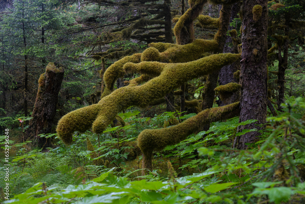 The trees covered by moss on Spruce island near Kodiak in Alaska