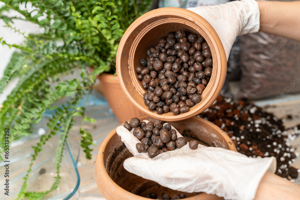 Gardener wearing gloves adding clay pebbles to flower pot for improved drainage and aeration, preparing soil mix for houseplants or hydroponic gardening in sustainable home garden setup.