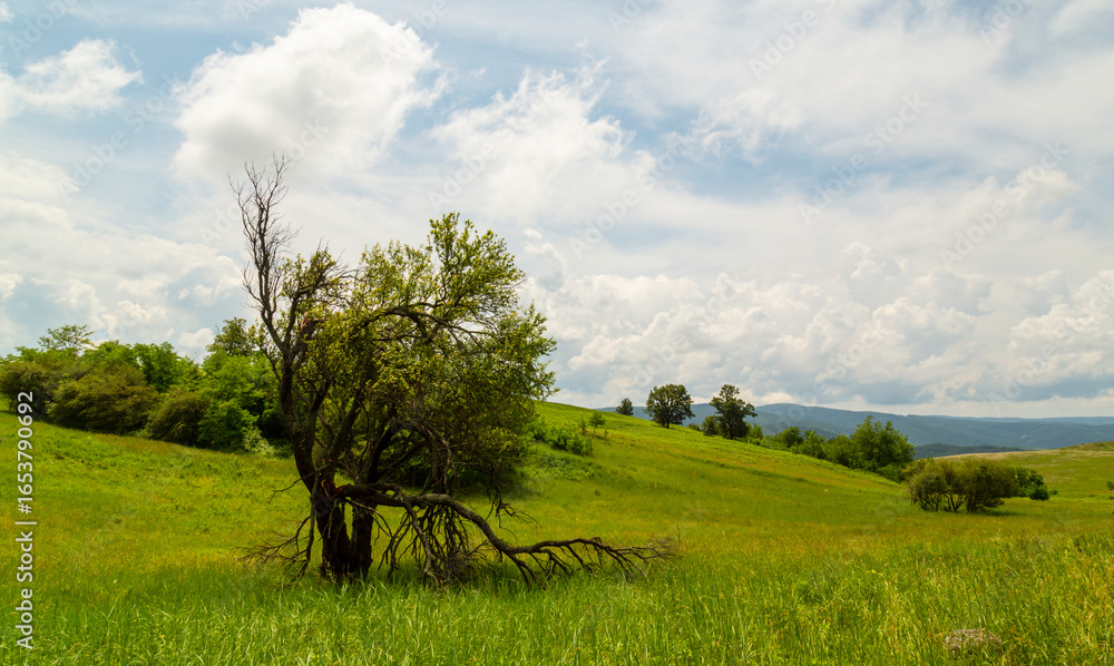 Beautiful mountain scenery with wavy wild grass fields in summer, in a remote area in Europe