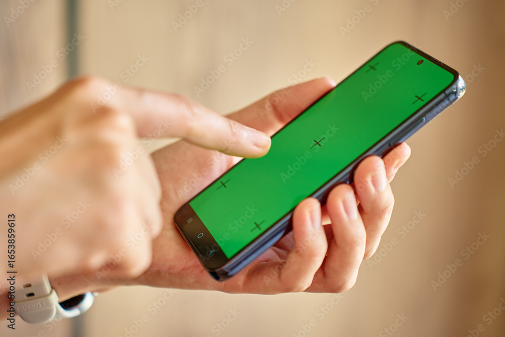 Hands holding smartphone and touching display with green screen and tracking markers. Person using mobile phone, close up