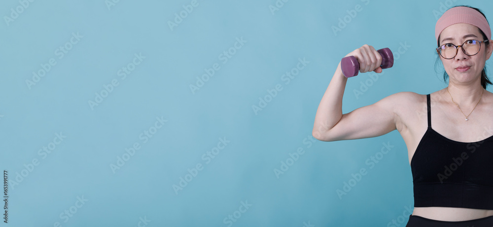 Healthy habits and achieving physical wellness, A determined woman flexing her arm while holding a dumbbell, showcasing her strength and dedication to fitness, isolated on blue long banner