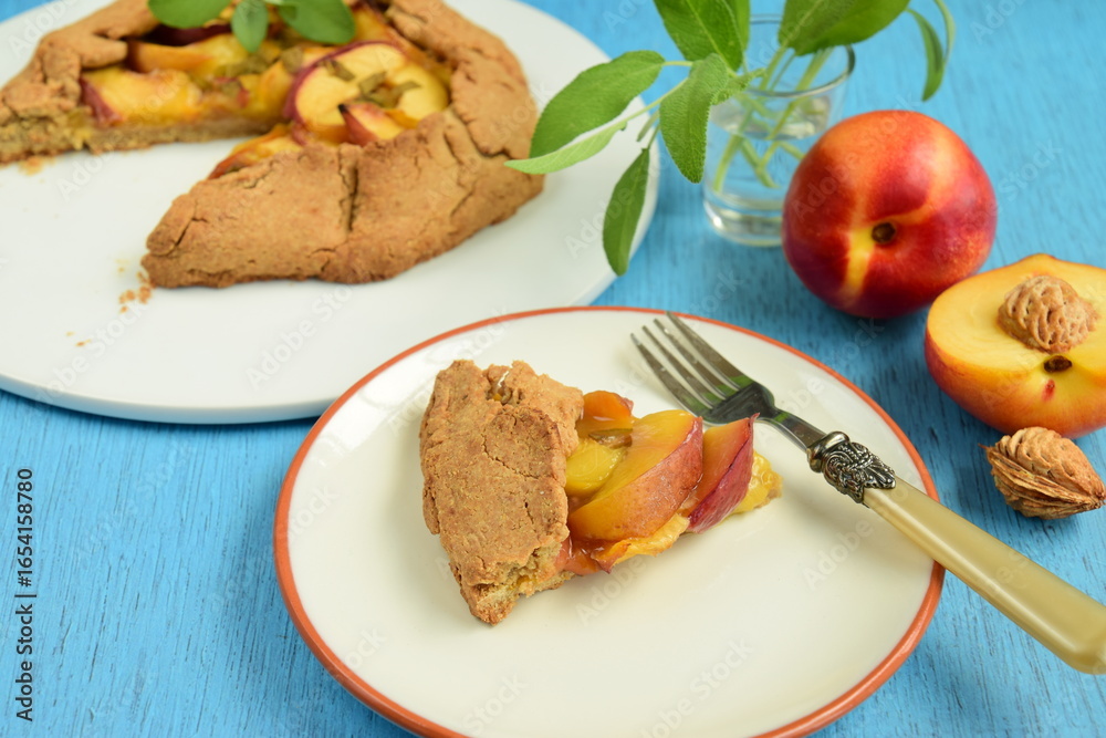 Nectarine galette with sage and honey on blue background