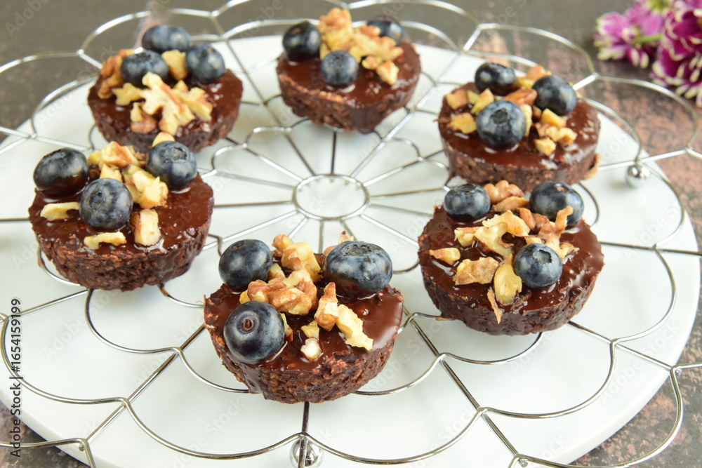 Mini chocolate oatmeal cupcakes with melted dark chocolate, chopped walnuts and fresh blueberries