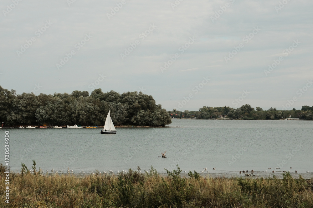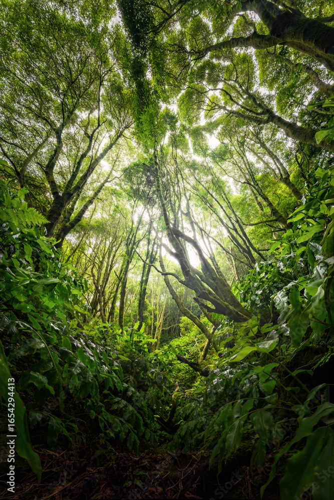 Azorean tropical forest in morning light on São Miguel island. Beautiful landscape with bush, river and green trees in the jungle. Summer scene from nature, Azores Islands, Portugal