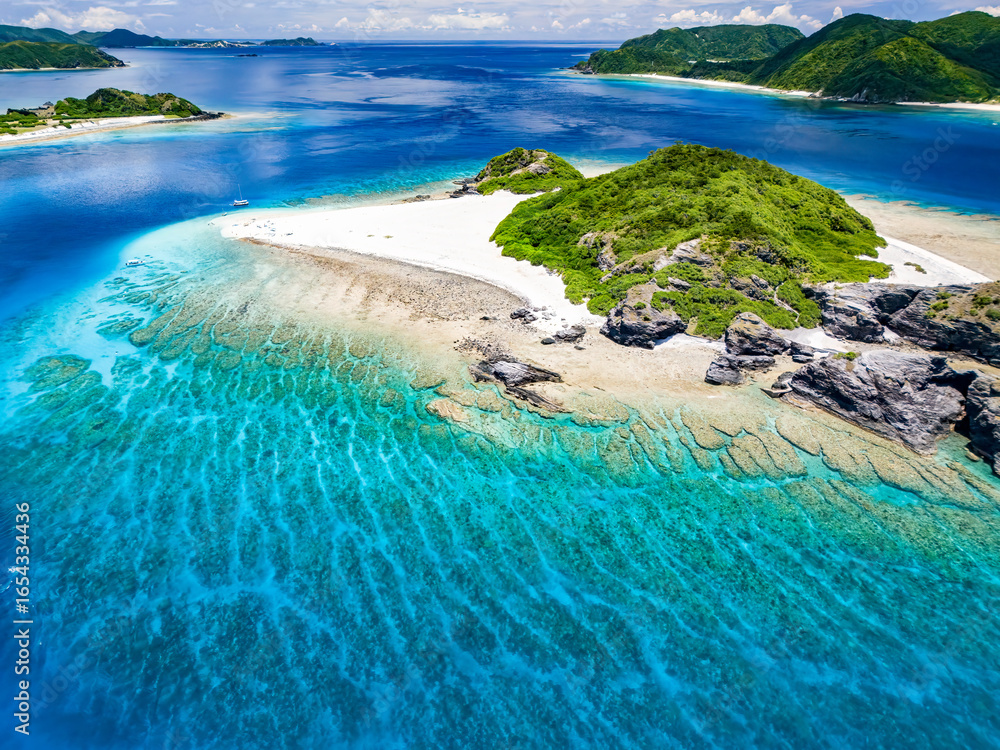 青い海の白砂のビーチが美しい無人島、嘉比島のドローン撮影(沖縄県島尻郡慶良間諸島座間味島嘉比島) 島には白い灯台がある。 座間味島や渡嘉敷島、阿嘉島も見えている。