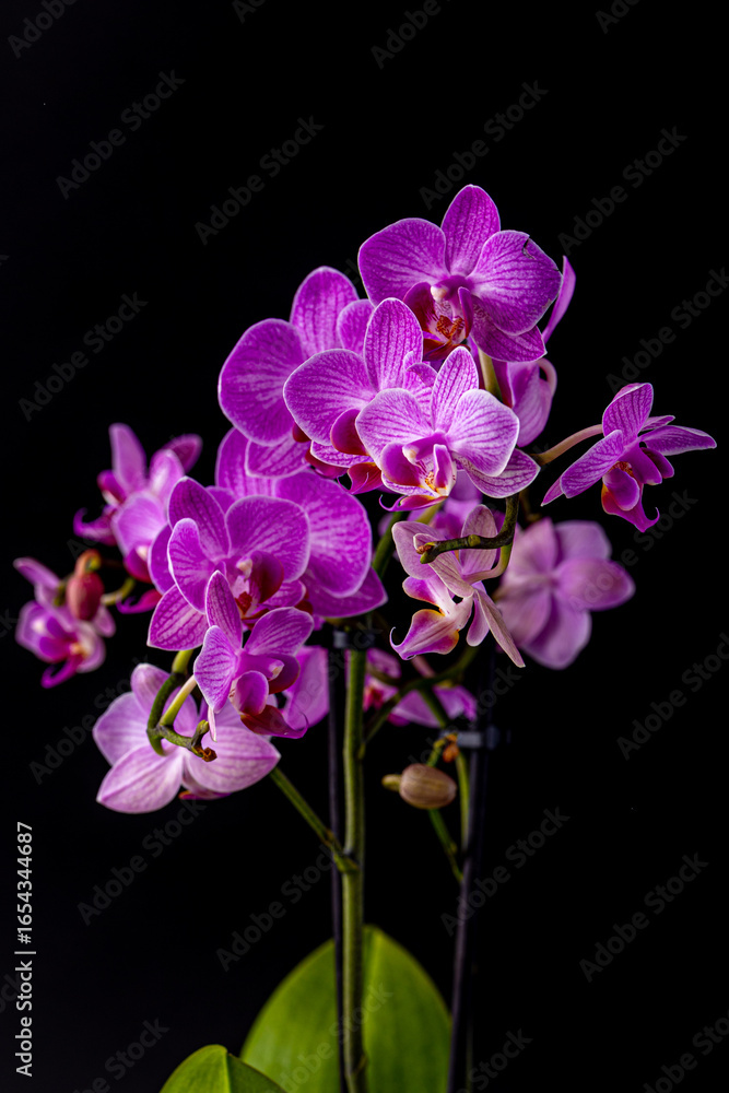 Floral concept. Orchid growing tips. Most commonly grown house plants. Orchids blossom close up. Orchid flower pink and yellow bloom. Phalaenopsis orchid.