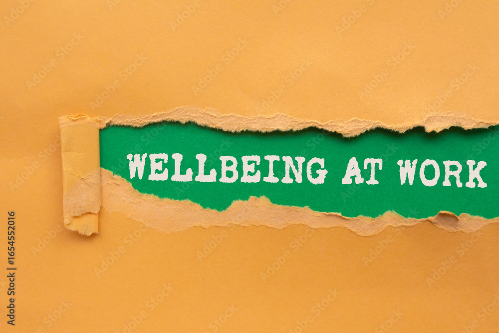 Wellbeing at work message written on ripped torn orange paper on green background. Conceptual wellbeing at work symbol. Copy space.