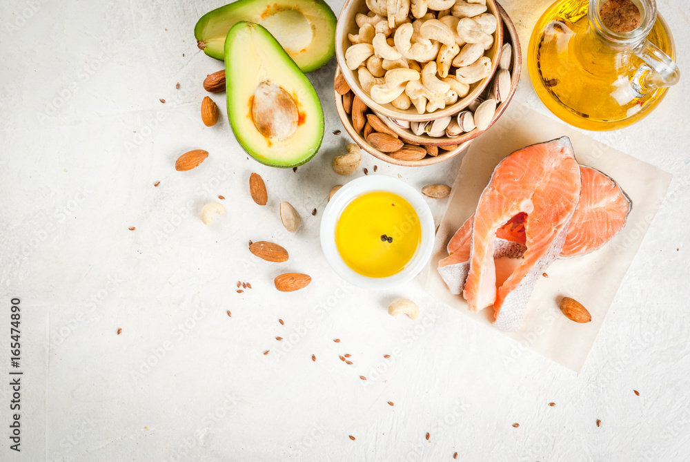 Healthy food. Products with healthy fats. Omega 3, omega 6. Ingredients and products: trout (salmon), flaxseed oil, avocado, almonds, cashews, pistachios. On a white stone table. Copy space top view