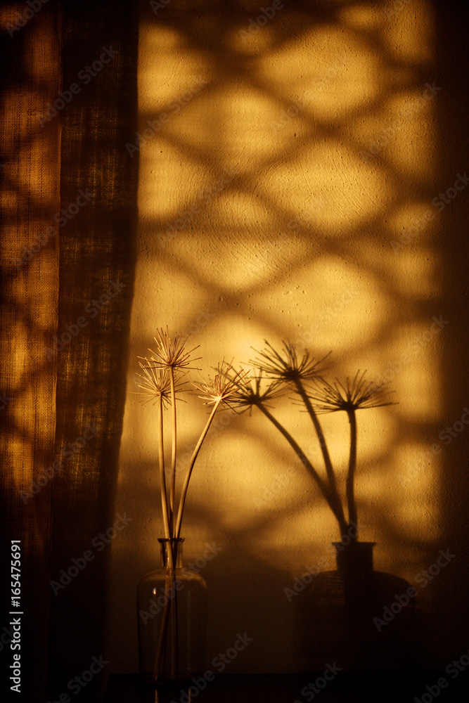 Bottle with dry stalks of plants on the background of the wall with the shadow of the window with a lattice
