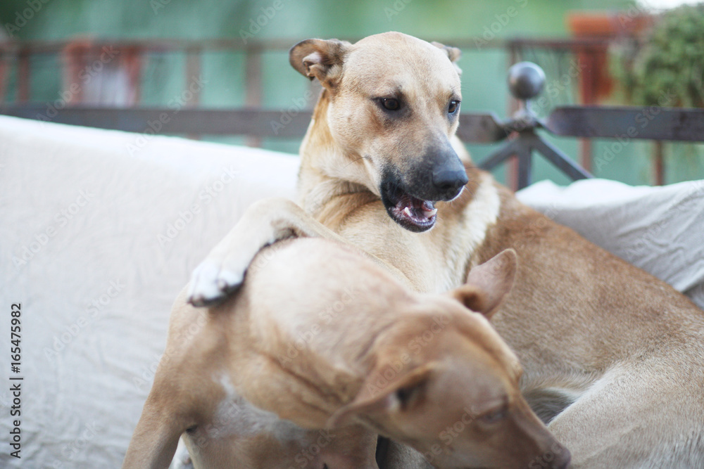 Two dogs of a large breed are playing on the couch on the terrace of the house
