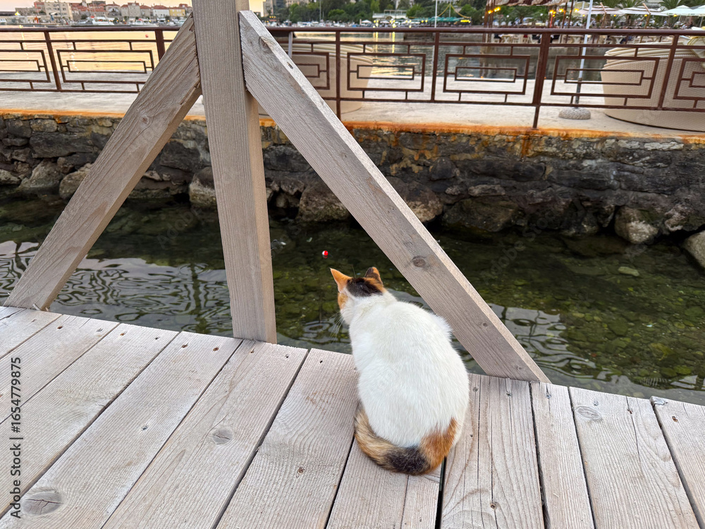 A calico cat sits on the wooden pier and looks at the water near the city wall. Curiosity, patience and instinct symbolized through a calm feline perspective.