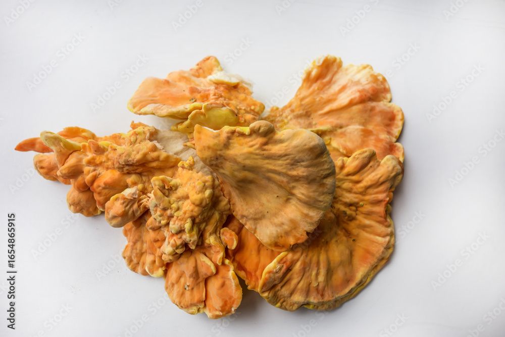 Chicken of the woods (Laetiporus sulphureus), close-up. Isolated on white background with shadows.