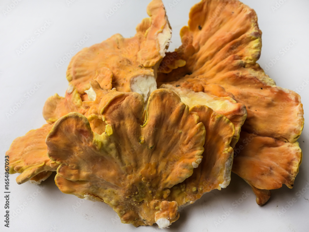 Chicken of the woods (Laetiporus sulphureus), close-up. Isolated on white background with shadows.