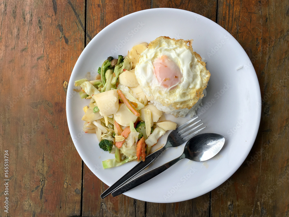 Stir-fried mixed vegetables with tofu and fried egg with rice in white dish on wooden background. Vegetarian Food, healthy food.
