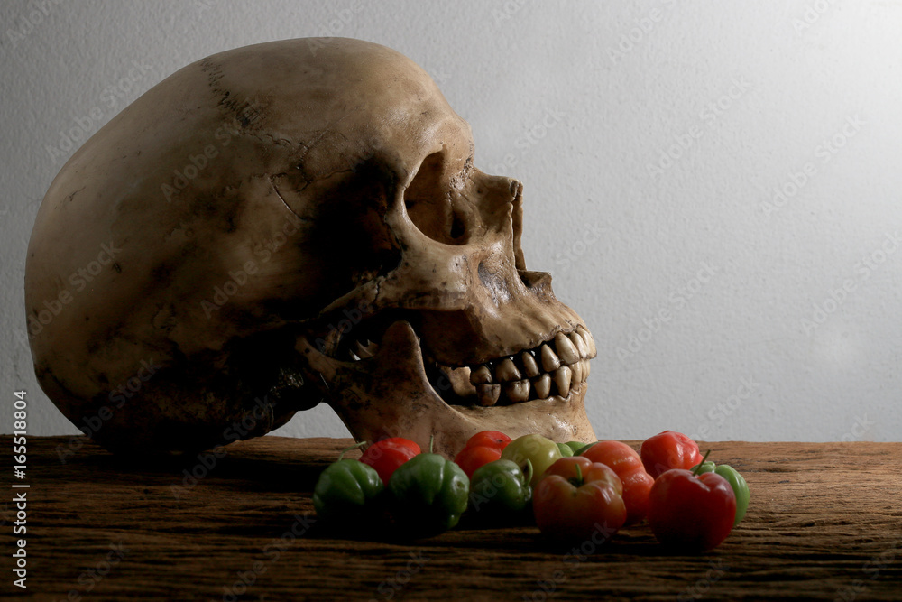 Still life photography with human skull and fresh Cherries at harvest time on wooden table with wall background.