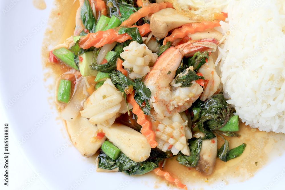 Asian food, Stir fried seafood with chili paste and basil leafs with rice on white plate, Spicy hot chilli Thai food.
