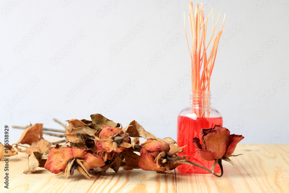Hand made pf Fragrance Diffuser Set: bottle with aroma sticks and dry red rose (reed diffusers), a spray bottle with perfume on pine wood table with wall background.