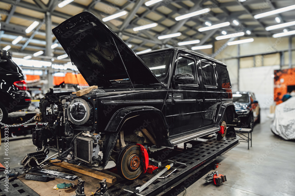 A broken car with a violation of geometry is on the frame for straightening. Restoration of cars with a chain and a hook. Repair in a workshop and car service.