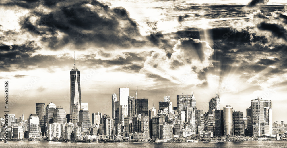 Panoramic view of Lower Manhattan from Ellis Island at dusk, New York City