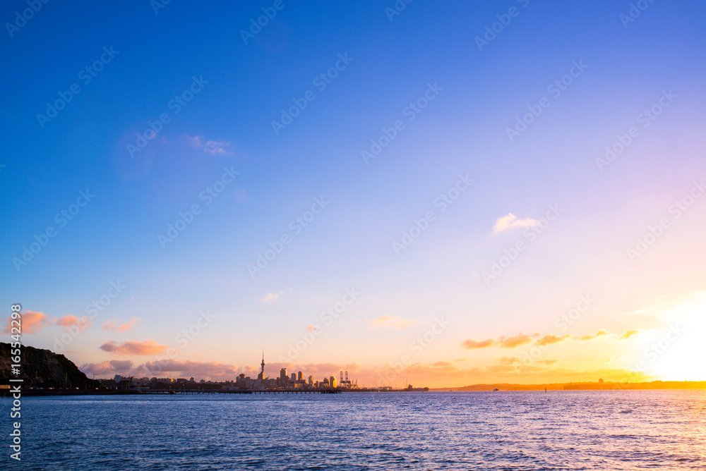 sunset on Auckland city’s skyline with the harbour, the ocean and some boats at the front