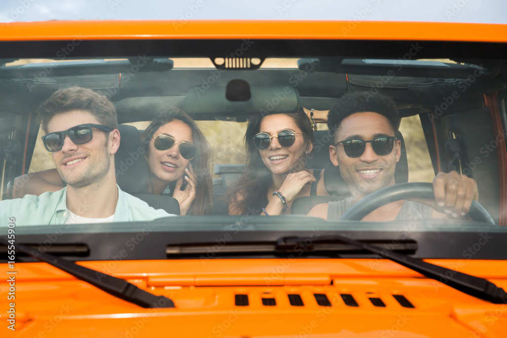 Group of a four cheerful young friends sitting in a car