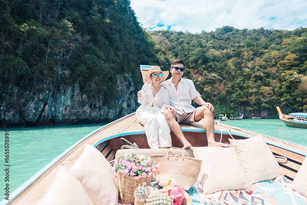Happy couple tourist in private longtail boat trip to koh Hong lagoon island at Krabi, Thailand. Honeymoon, tropical destination, southeast Asia Travel, summer vacation and wanderlust concept
