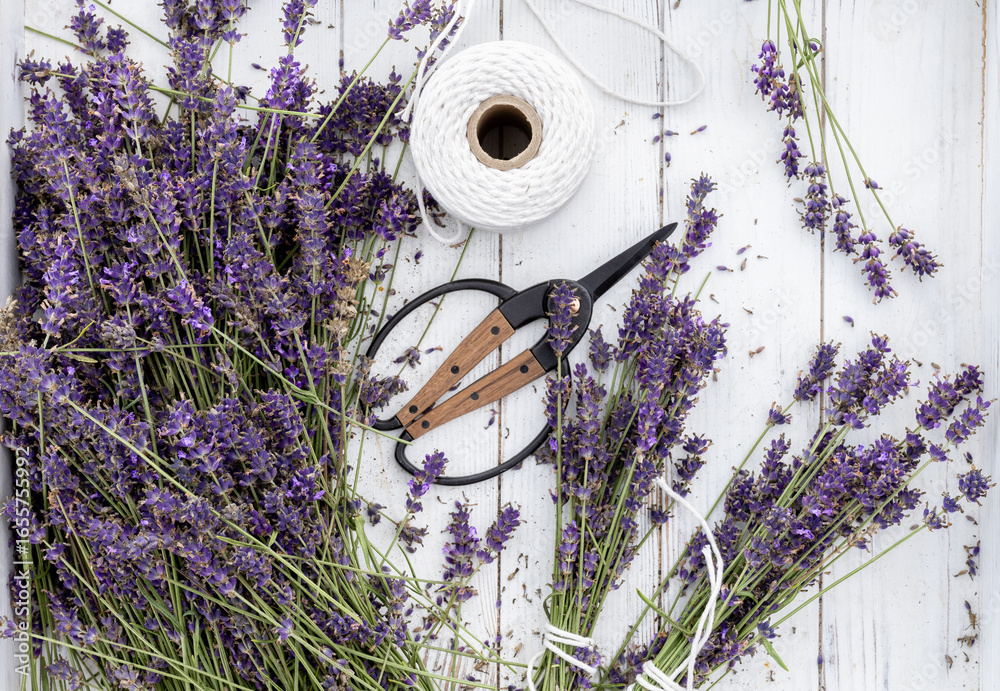 Lavender flowers on a wooden background. Harvesting fresh lavender for drying.