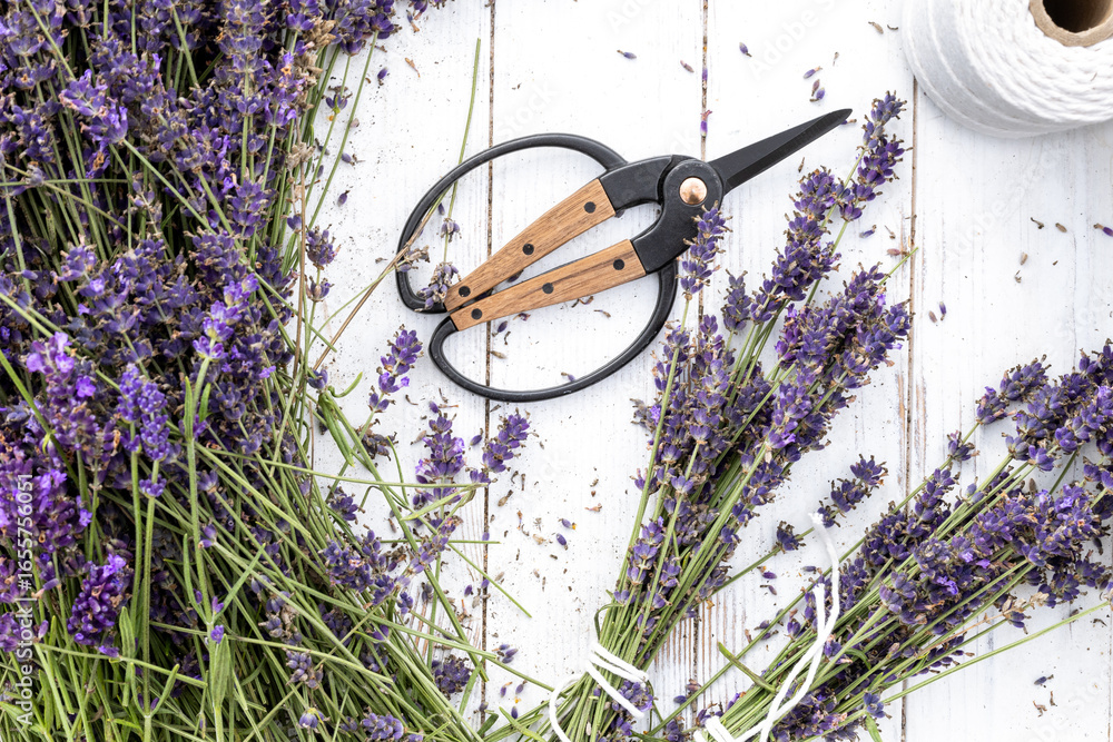 Lavender flowers on a wooden background. Harvesting fresh lavender for drying.