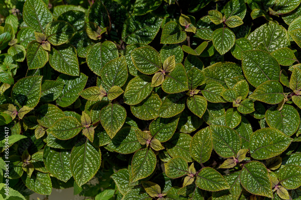 Glossy green leaves with serrated edges overlap in a dense, rhythmic pattern. Subtle purple tones near the leaf bases add depth and contrast.