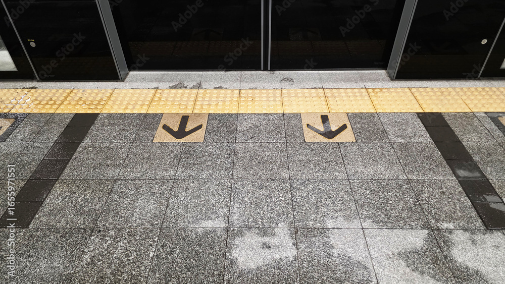 Directional arrows on MRT Yellow Line platform Bangkok.18 Aug 2025. Bangkok. Thailand