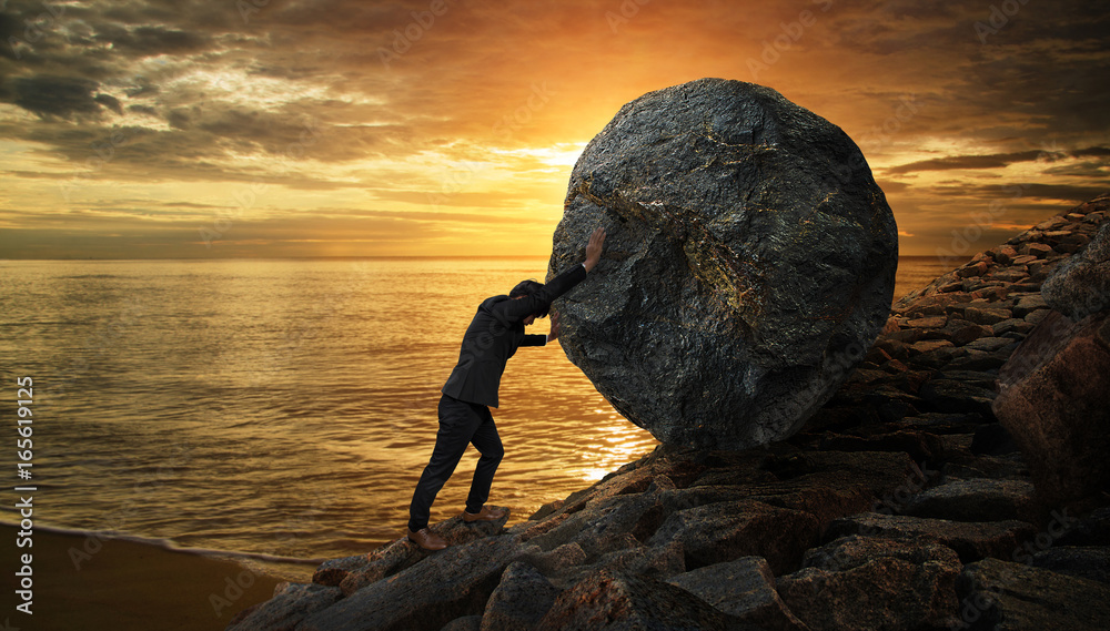 Business man pushing large stone up to hill , Business heavy tasks and problems concept.
