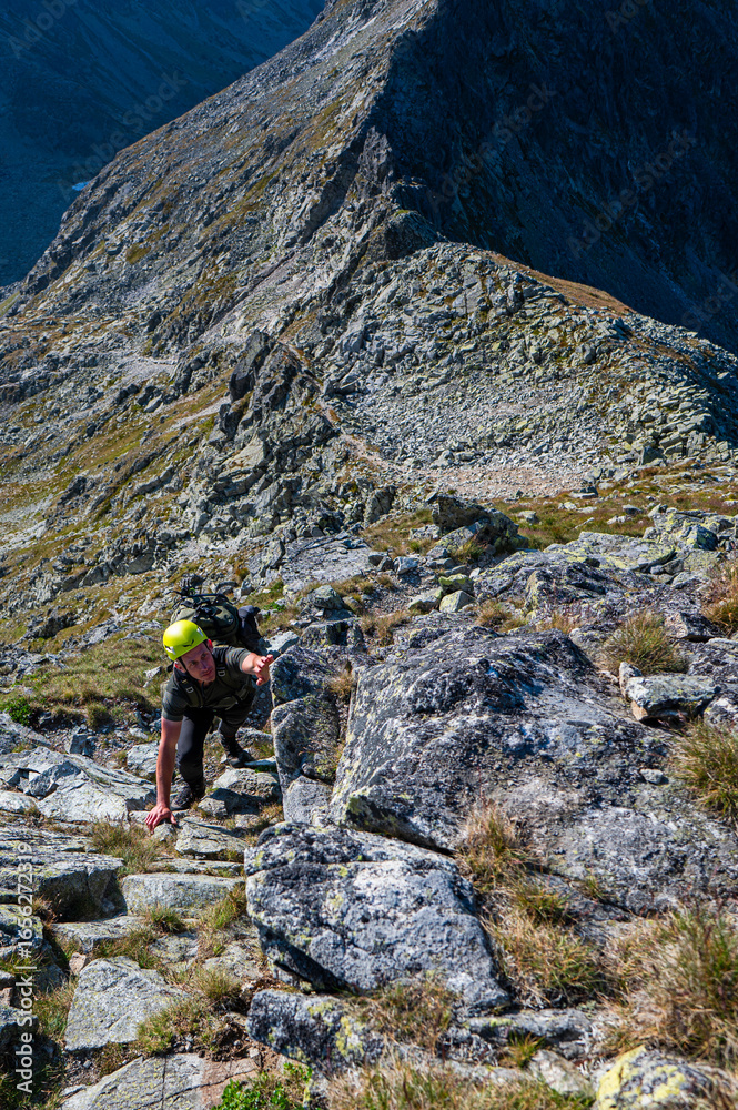 A man climbing a rocky peak in the mountains