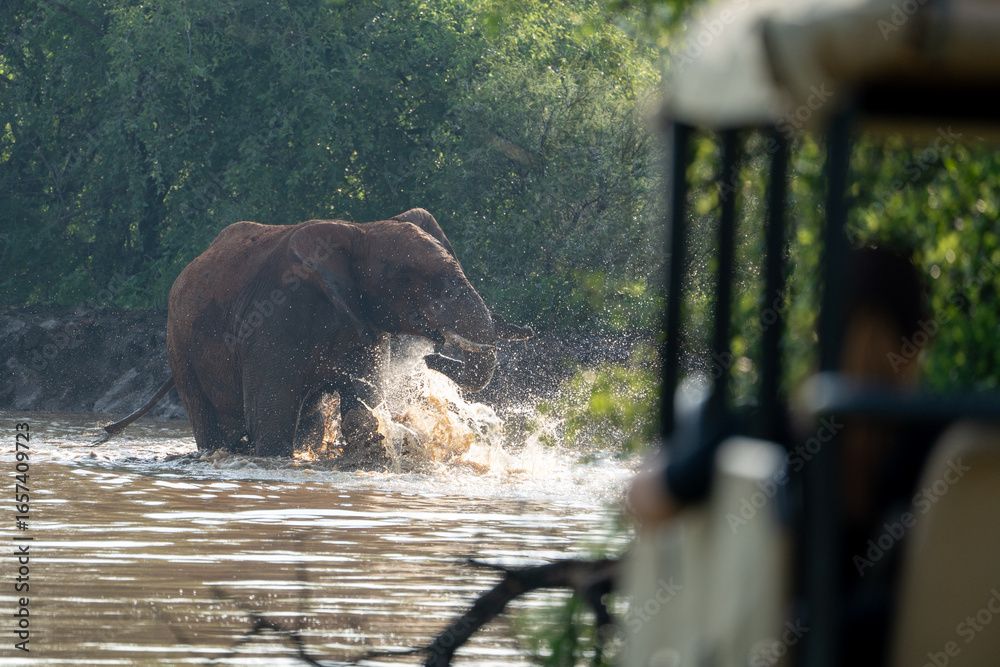 An elephant splashes around in the water to cool off from the heat. Safari tour in Pilanesberg National Park, South Africa.