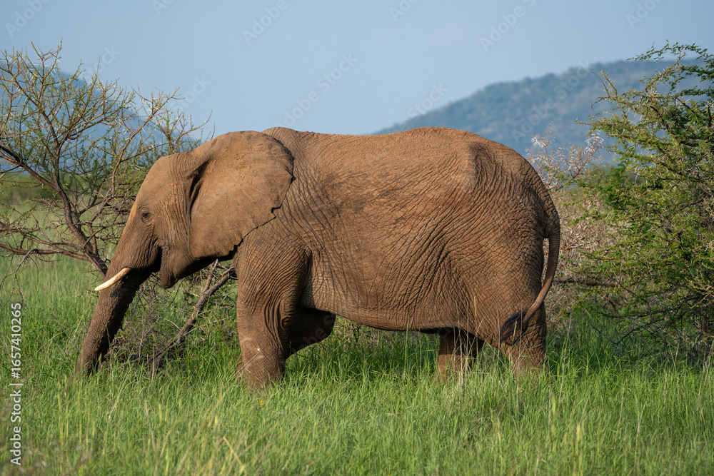 Beautiful elephant portraits on a green, lush meadow with a soft background on a safari in Pilanesberg National Park. Symbolic travel photo for safaris in South Africa.