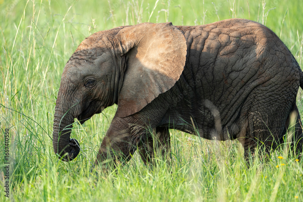 Herd of elephants with cute young calves spotted on safari in Pilanesberg National Park, South Africa.