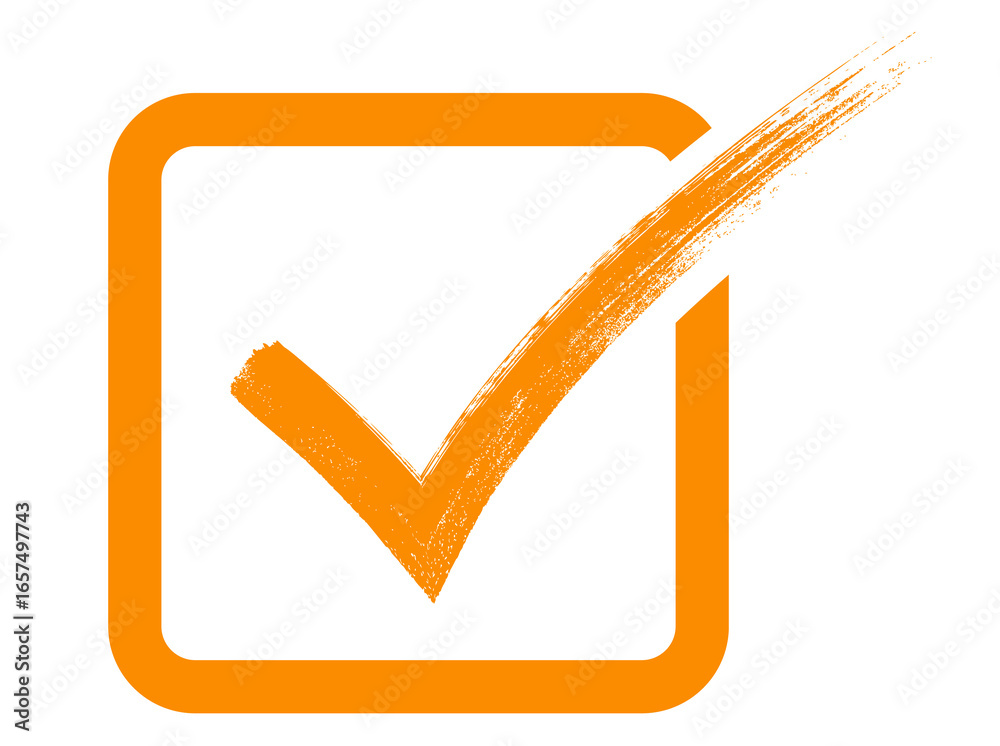 Orange checkmark icon inside square box, hand-drawn brush painted tick symbol, PNG with transparent background, used for checklist, workflow, and confirmation designs