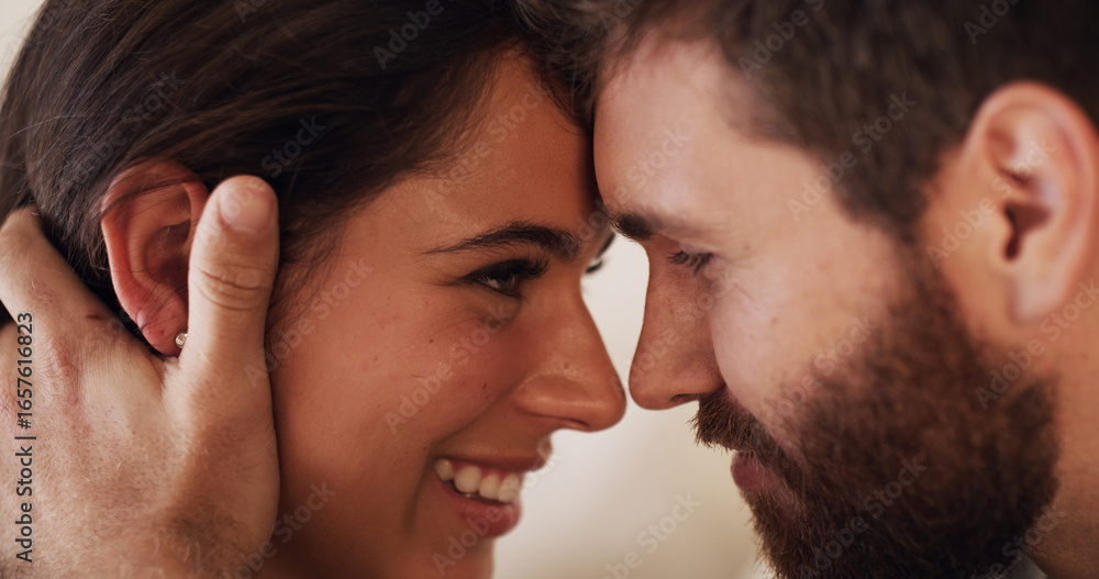 Forehead, love and romance with face of couple in home bedroom together for bonding or safety. Security, smile or trust with man and woman in apartment for anniversary, honeymoon or wellness