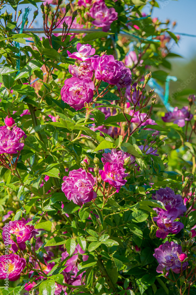 Delicate pink roses bloom abundantly in a lush garden, bathed in sunlight and vibrancy