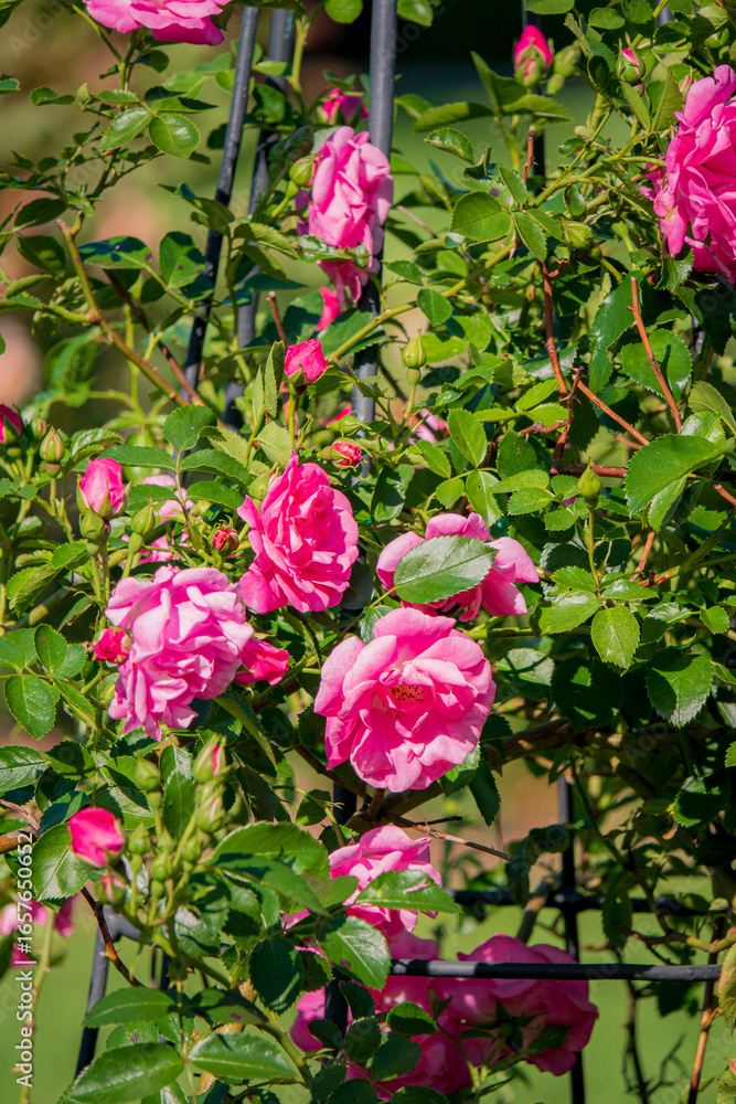 Pink roses cascade over a trellis, basking in the warm midday sunlight