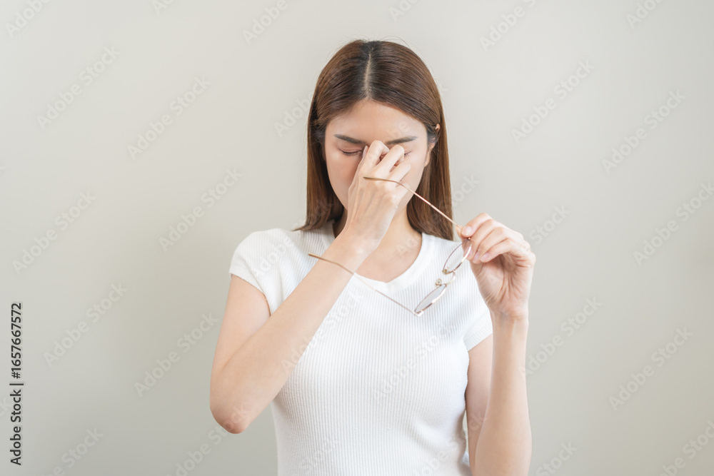 Eye problem concept, fatigue asian young woman tired eyes irritated rubbing, massage nose, relief vision pain after work, eye strain, hand holding glasses, suffer bad blurry isolated on background.