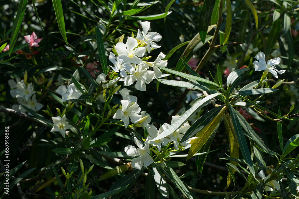 Delicate clusters of pure white oleander flowers (Nerium Oleander) flowers bloom among slender green leaves, creating fresh and vibrant contrast in sunlit garden