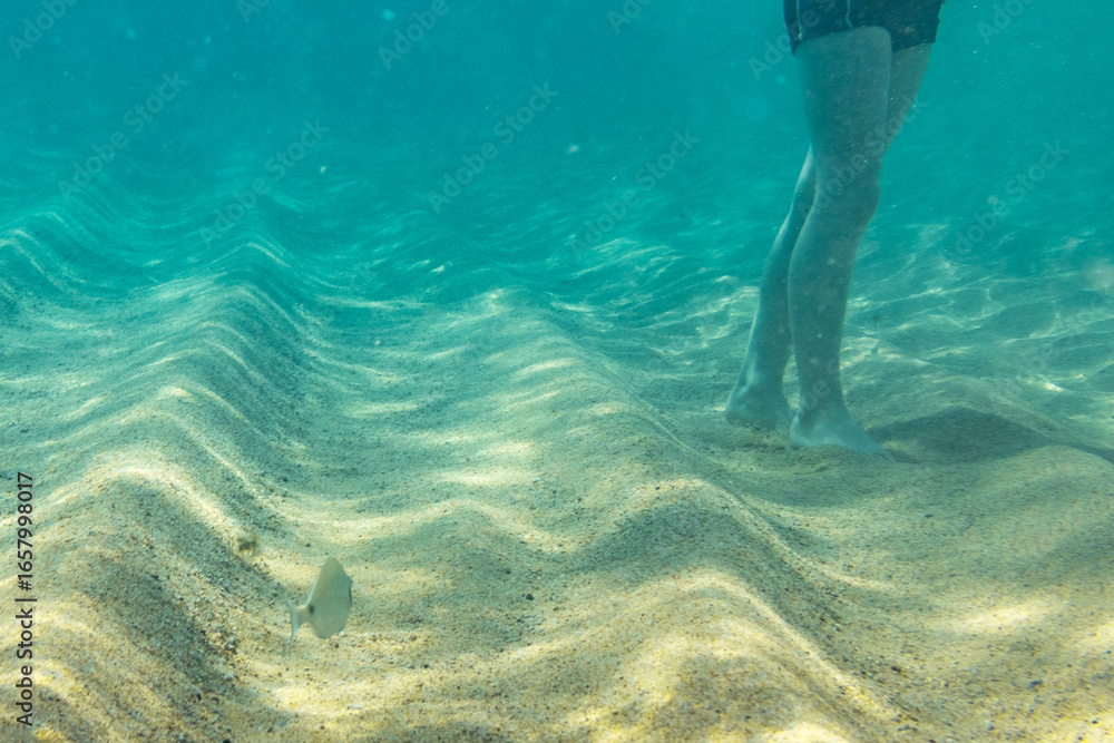 Small fish in clear turquoise water with human legs visible France Corsica 17 June 2025Small fish in clear turquoise water with human legs visible France Corsica 17 June 2025