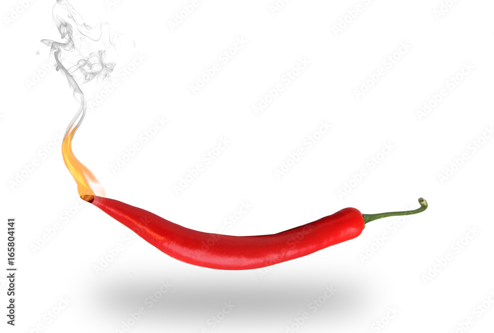 Concept photo of burning red hot chili pepper with smoke. Isolated on white background.