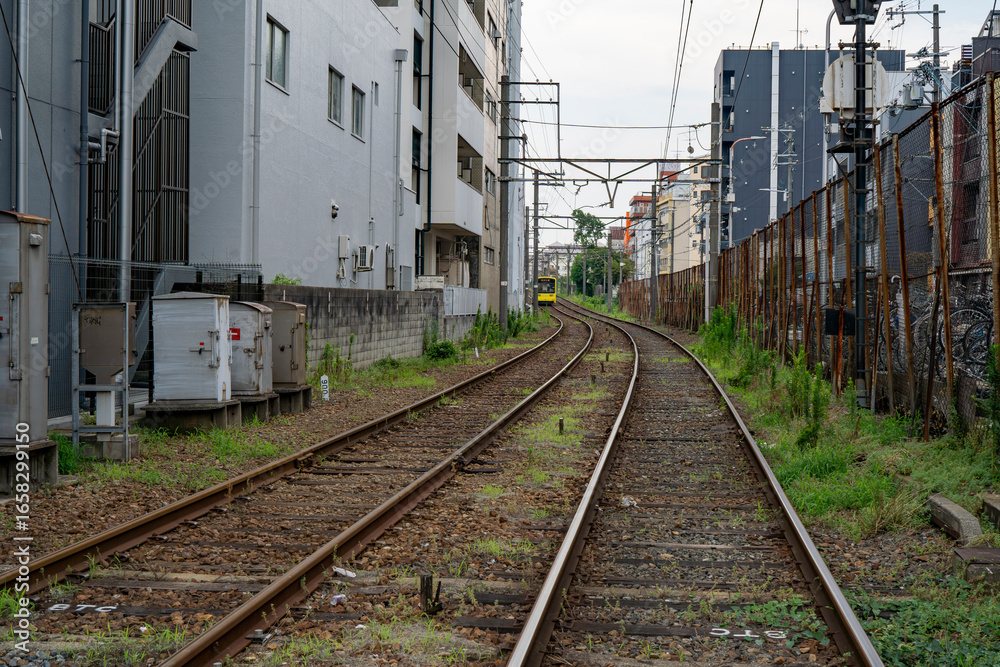 Close-up of train rail with urban buildings near Tennoji Tower, Osaka