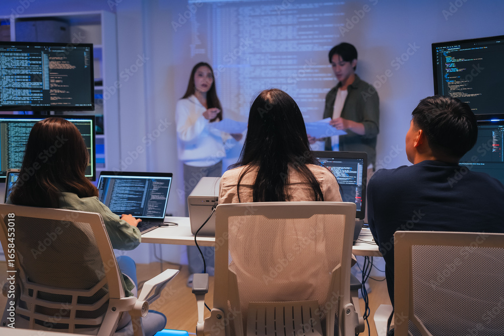 Our vibrant programmer team brainstorm discuss at night to discuss project goals and various strategic innovations. We actively reviewed code, focusing on the development of vital systems vision