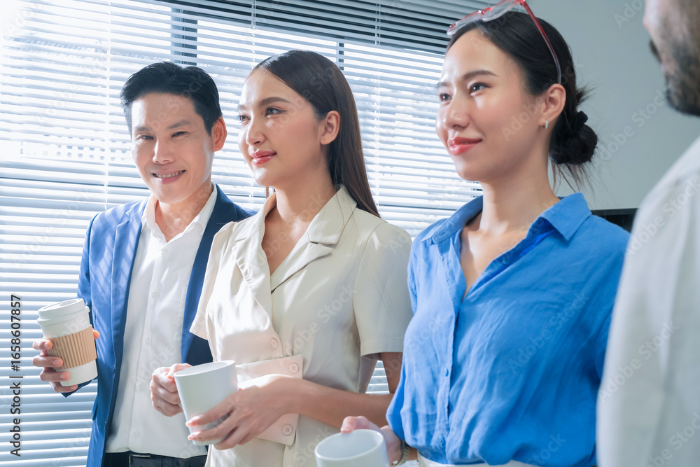 smart business portrait asian female and male wear smart casual cloth confident smile goal vision success standing together teamwork modern startup business office lifestyle office interior