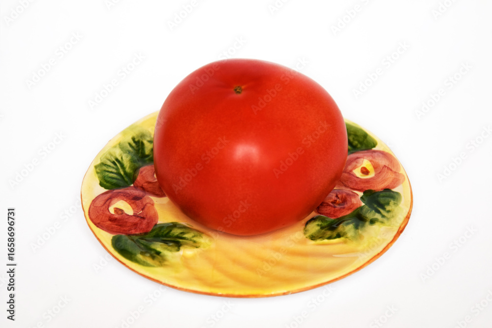 Large ripe red tomato on ceramic plate. Concept of natural healthy nutrition. Organic food. Close-up.