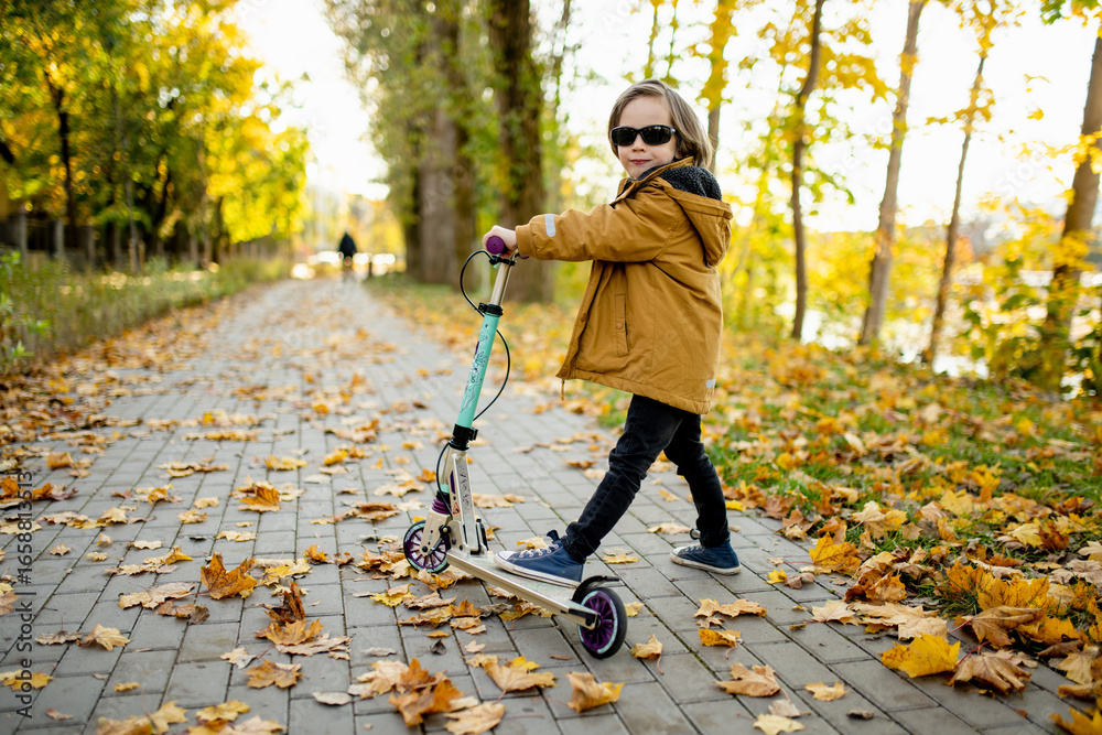 Adorable boy riding his scooter in a city on sunny autumn evening. Young child riding a roller. Active leisure and outdoor sports for kids.